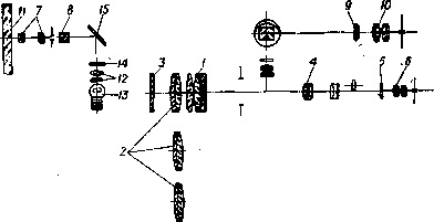 Оптическая схема прибора состоит из зрительной трубы и отсчетного микроскопа с осветительной системой. Схема изображена на рис. 1, где 1 — объектив зрительной трубы, 2 — сменные насадочные линзы, 3 — светофильтр, 4 — фокусирующая линза, 5 — сетка, 6 — окуляр, 7 — микрообъектив отсчетного микроскопа, 8 — призма-куб, 9 — масштабная сетка, 10 — окуляр. В осветительную часть микроскопа, предназначенную для подсветки шкалы 11, входят конденсор 12, источник света 13, светофильтр 14 и зеркало 15.