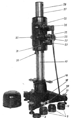 Измерительная каретка 22, несущая зрительную трубу 23 и отсчетный микроскоп 24, перемещается по колонке на роликах. Грубое перемещение измерительной каретки по вертикали осуществляется от руки при открепленном винте 25, точное — с помощью микрометрического винта 26 при закрепленном винте 25.