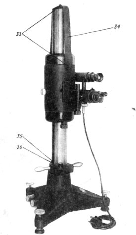 Зрительная труба 23 укреплена на каретке. Фокусировка трубы на выбранную точку объекта производится вращением маховичка 29, грубая наводка осуществляется с помощью механического визира, состоящего из целика и мушки, укрепленных на тубусе зрительной трубы. Сбоку на тубусе имеется цилиндрический уровень 30, ось которого параллельна визирной оси зрительной трубы. Установка уровня в горизонтальное положение осуществляется микрометрическим винтом 30 путем совмещения изображения концов пузырька, рассматриваемого через лупу 32. При совмещенных половинках пузырька визирная ось зрительной трубы принимает строго горизонтальное положение.